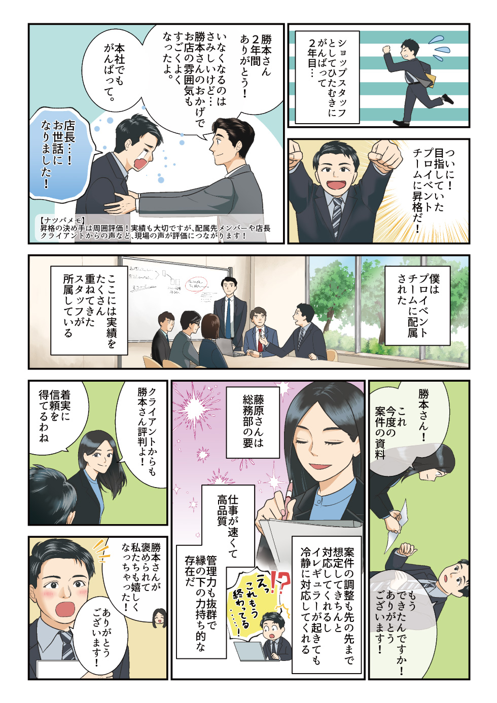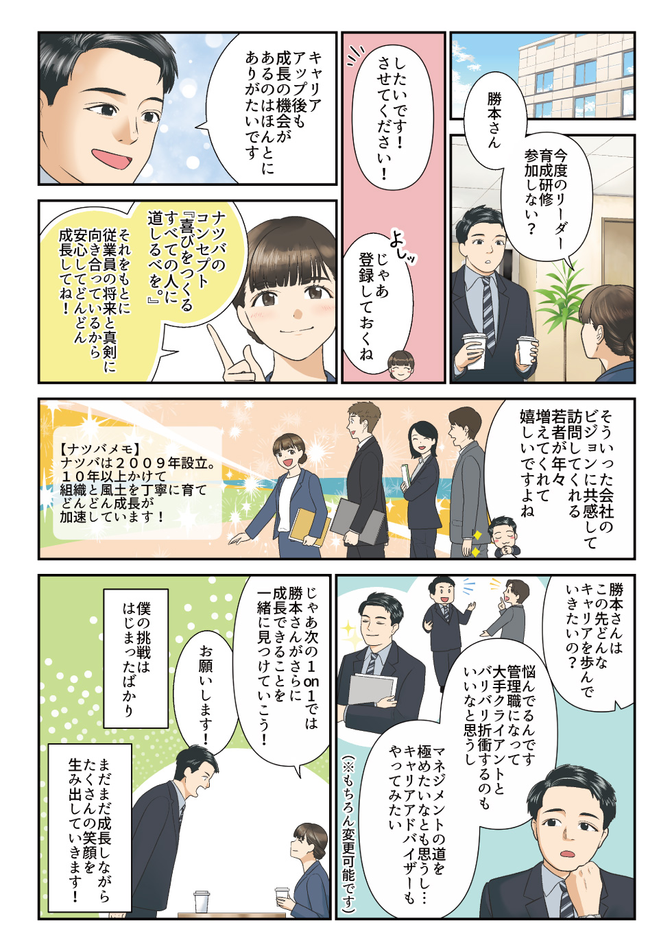 実際に活躍されている社員様の成長過程をストーリーとして可視化し、「なぜ成長できたのか」「どのような環境がそれを支えているのか」が伝わるマンガの制作。